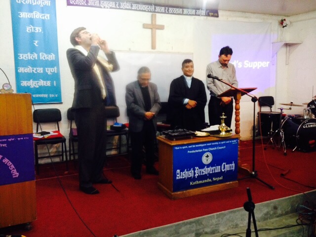 Giving a sermon comes naturally for Rob but his greatest challenge came during the Lord’s Supper. The rest of us were served pieces of naan bread and drank wine from little plastic cups, but shoeless Rob was expected to drink directly from a chalice in the Nepali way, which means without touching his lips to its rim. That’s harder than it sounds but we all watched him closely and he didn’t spill a drop.