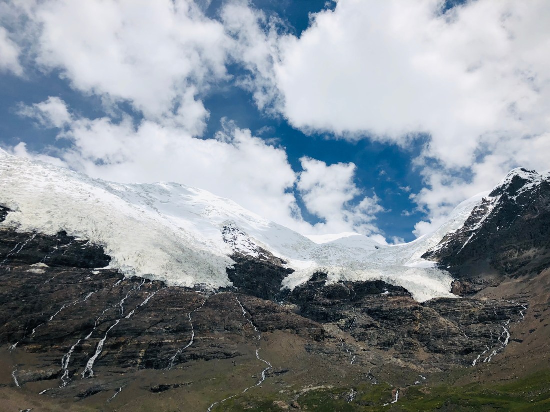 We see glaciers just a few steps from the roadway (the ones here haven’t melted yet), clear turquoise lakes shimmering in the sunshine, and distant snow covered peaks that look majestic by our standards but are not high or significant enough for Lansang to know their names. We see wild donkeys running on the steppe and eagles flying just a few feet from our vehicle.