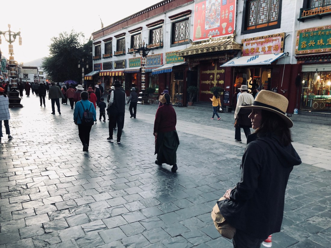 It is dark. Lhasa is on Beijing time even though it is located far to the west of it so everything seems off; sunrise and sunset happen later than we expect. We got up for a morning walk at the usual time but it might as well be midnight. The few Tibetan pilgrims walking with us are mere shadows moving through the night. We pass one who is slowly prostrating his way down the stone walkway. Another is working the long line of prayer wheels, a clockwise spin to each one, softly murmuring a mantra to himself.