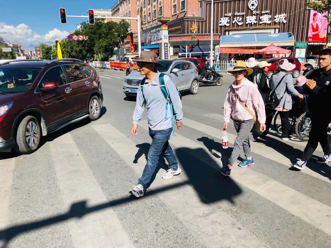 The Chinese people are cordial but not friendly like the Nepalis. The name of the gas stations is “U Smile”, but nobody does. The language barrier is as deep and wide as anywhere we have ever been. There is absolute nobody we encounter who speaks English. The upside of the Orwellian atmosphere is cleanliness. The streets are spotless but nearly empty when we walk in the mornings, a stark contrast to Nepal. We share the street only with the many uniformed street sweepers collecting any remnants of yesterday’s litter. The electric scooters in Lhasa are cleaner, too. They produce no fumes and are perfectly silent. Lobzang calls them the “silent killers” because they are driven with the same reckless abandon as in Nepal but here we can’t hear them coming.