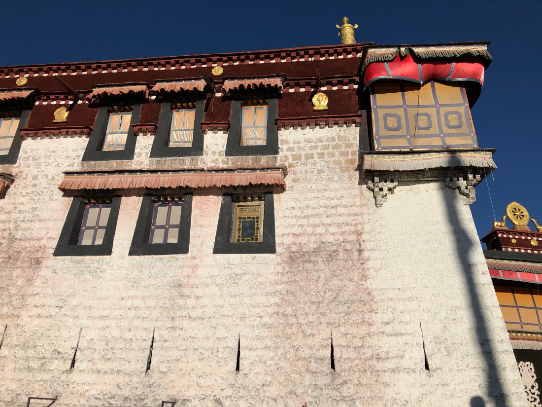 We are on the backside of the Potala Palace, the one thousand room edifice that sits atop a huge natural rock pedestal in the middle of otherwise perfectly level Lhasa, Tibet. It makes for dramatic scenery, as iconic as the Eiffel Tower or Statue of Liberty.