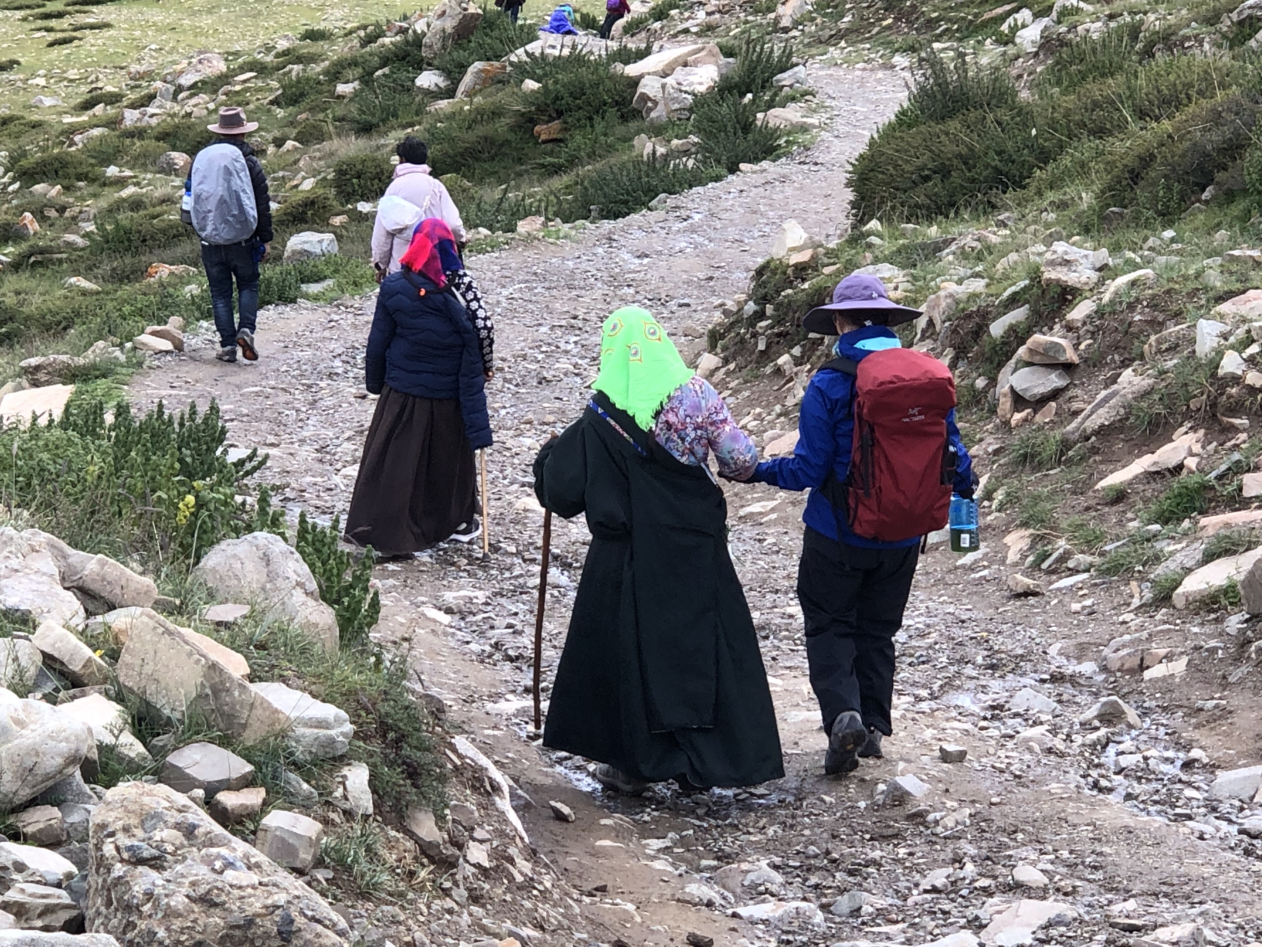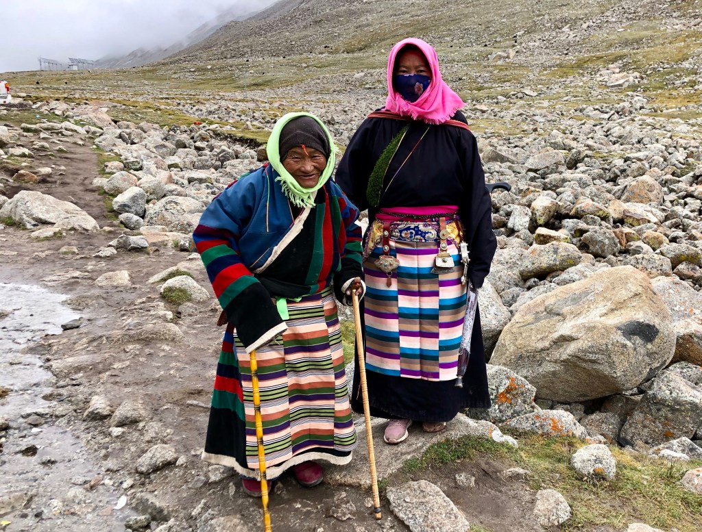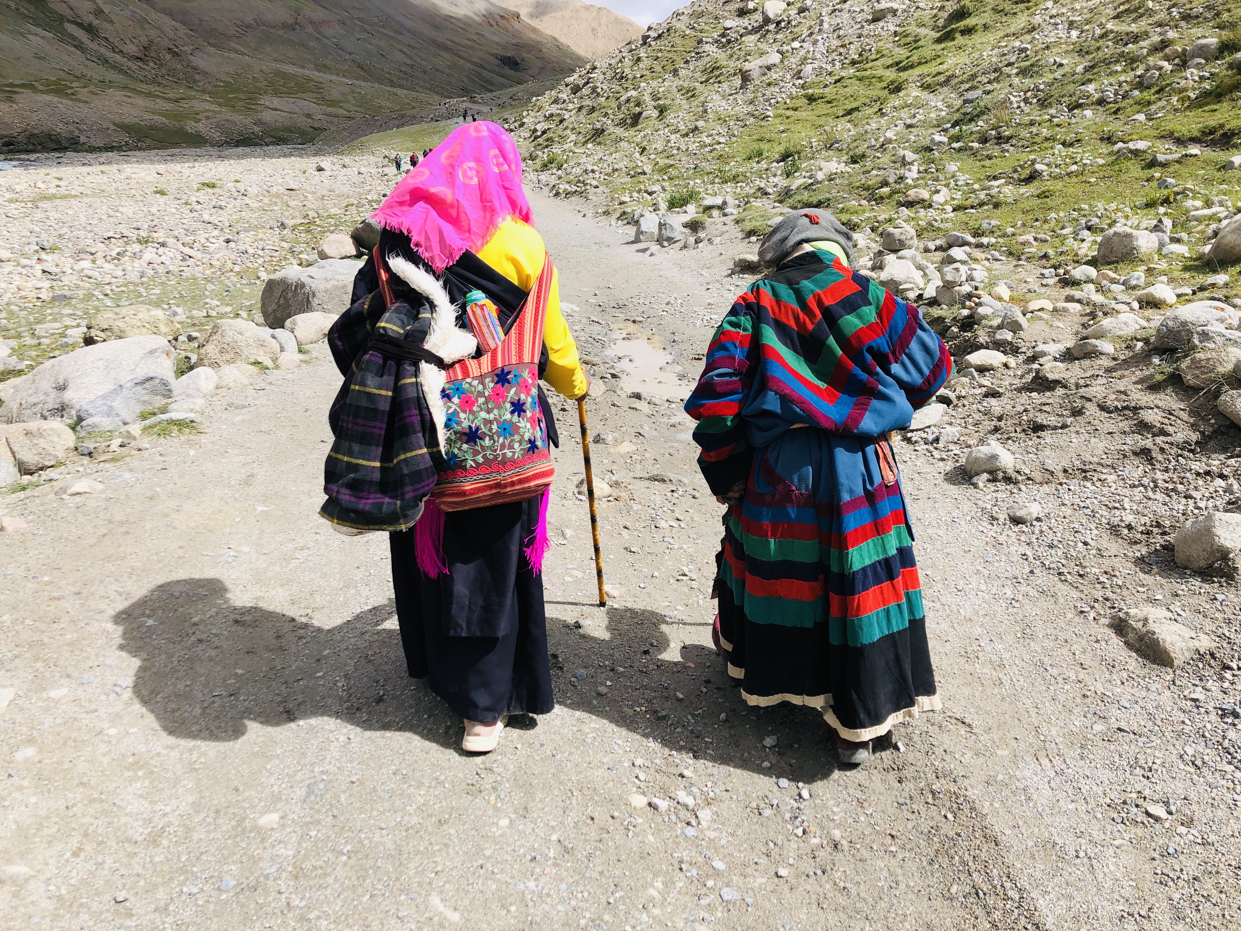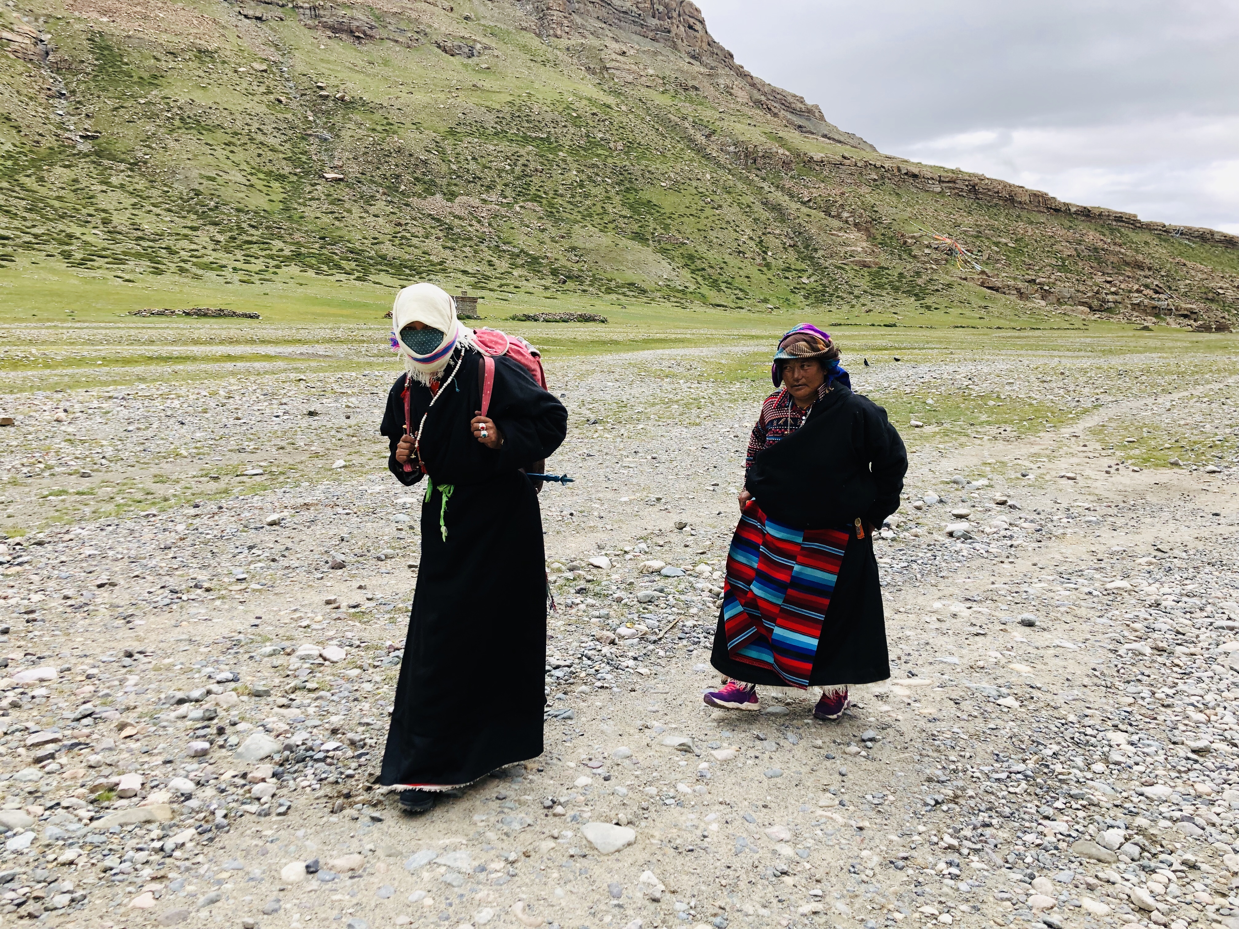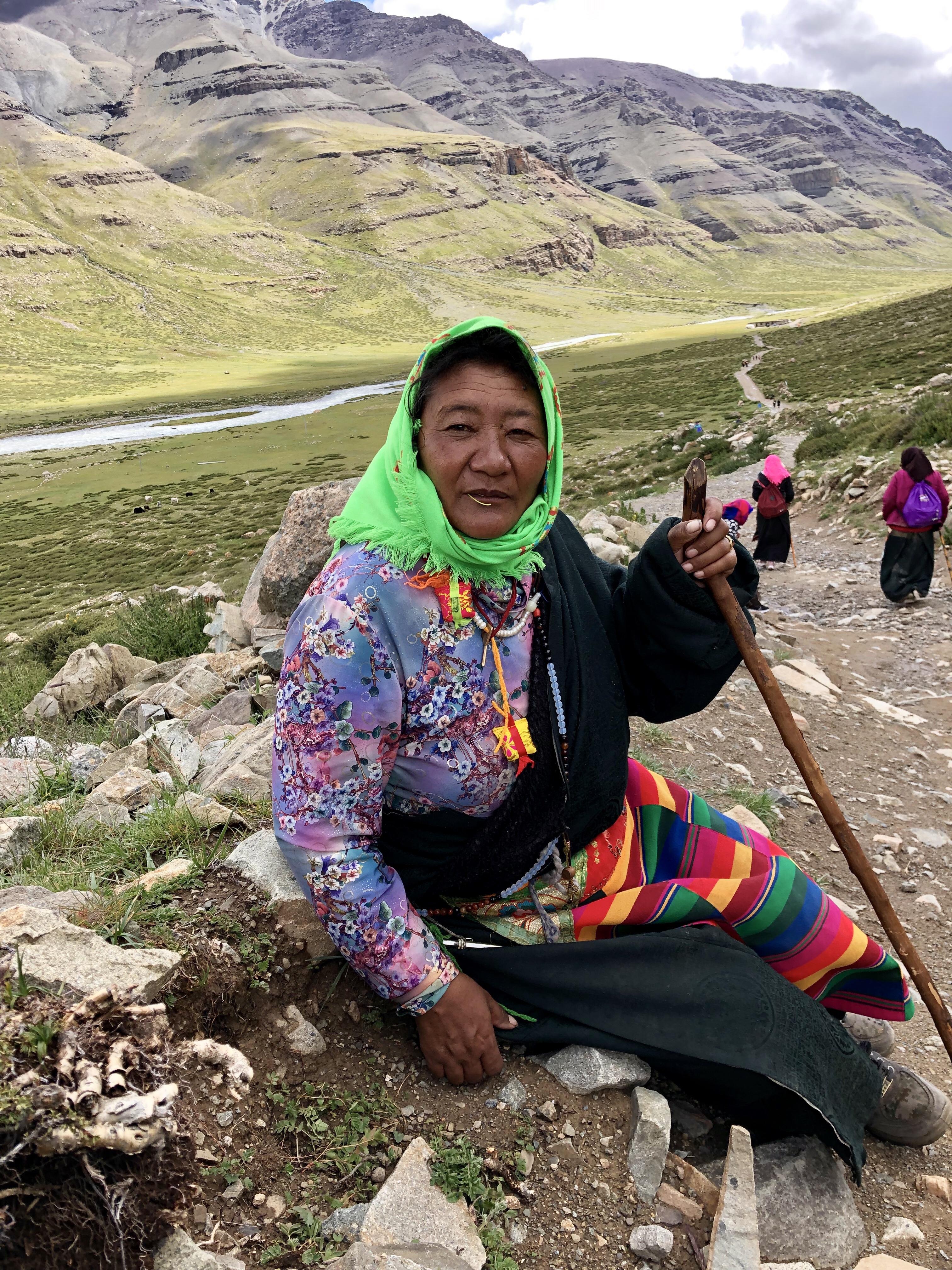 On the first day we meet a pilgrim woman in her seventies, stooped and using a cane as she walked, dressed in the familiar, multicolored stripes of Tibetan women. She has done the kora before and is determined to do it again, much to the alarm of her daughter. The mamma was not to be dissuaded, so there was nothing for the daughter to do but walk the kora with her.