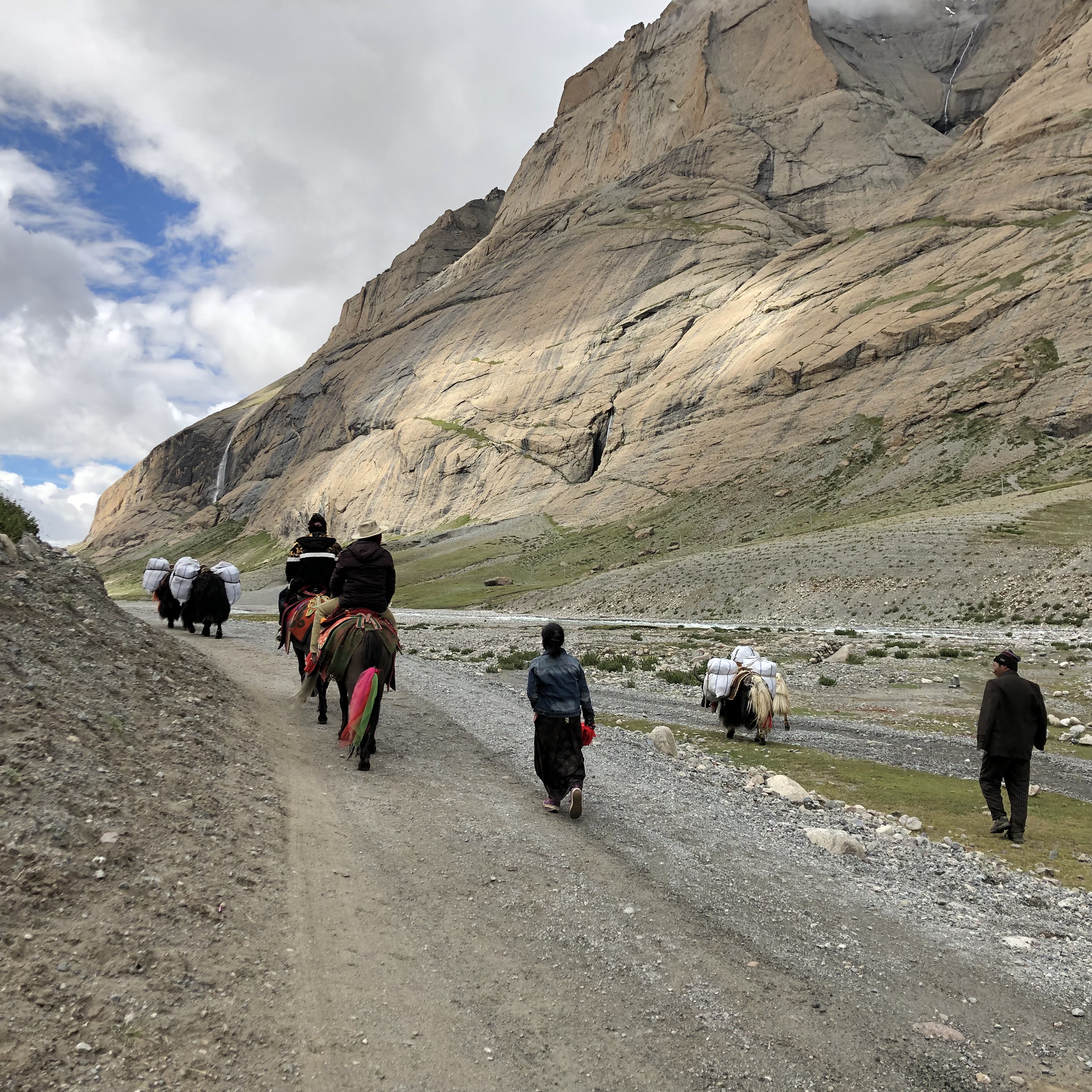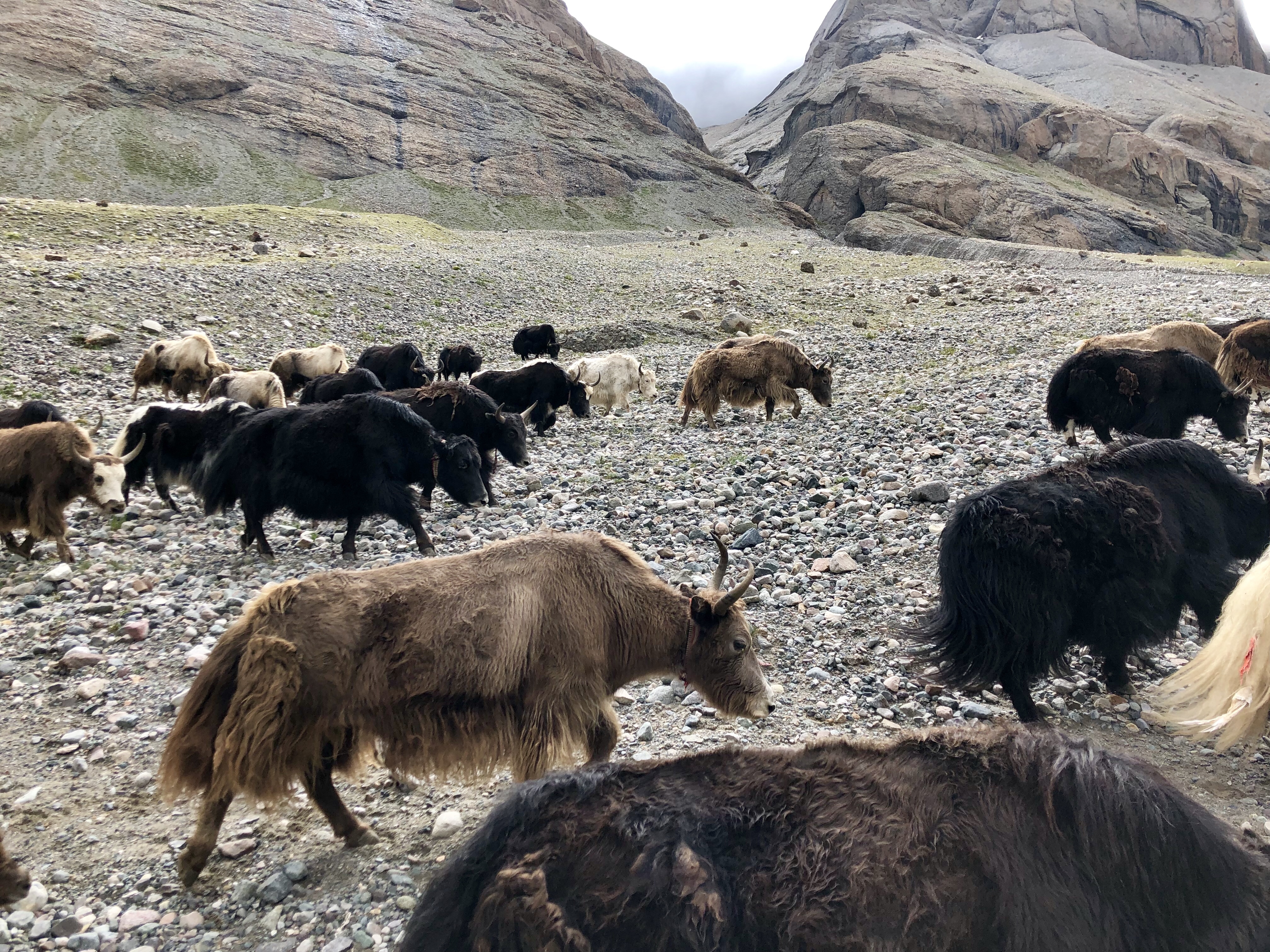 Herds of yaks, bells hanging from their necks and red tassels from their ears, wandering across the rocky slopes or the trail right in front of us.