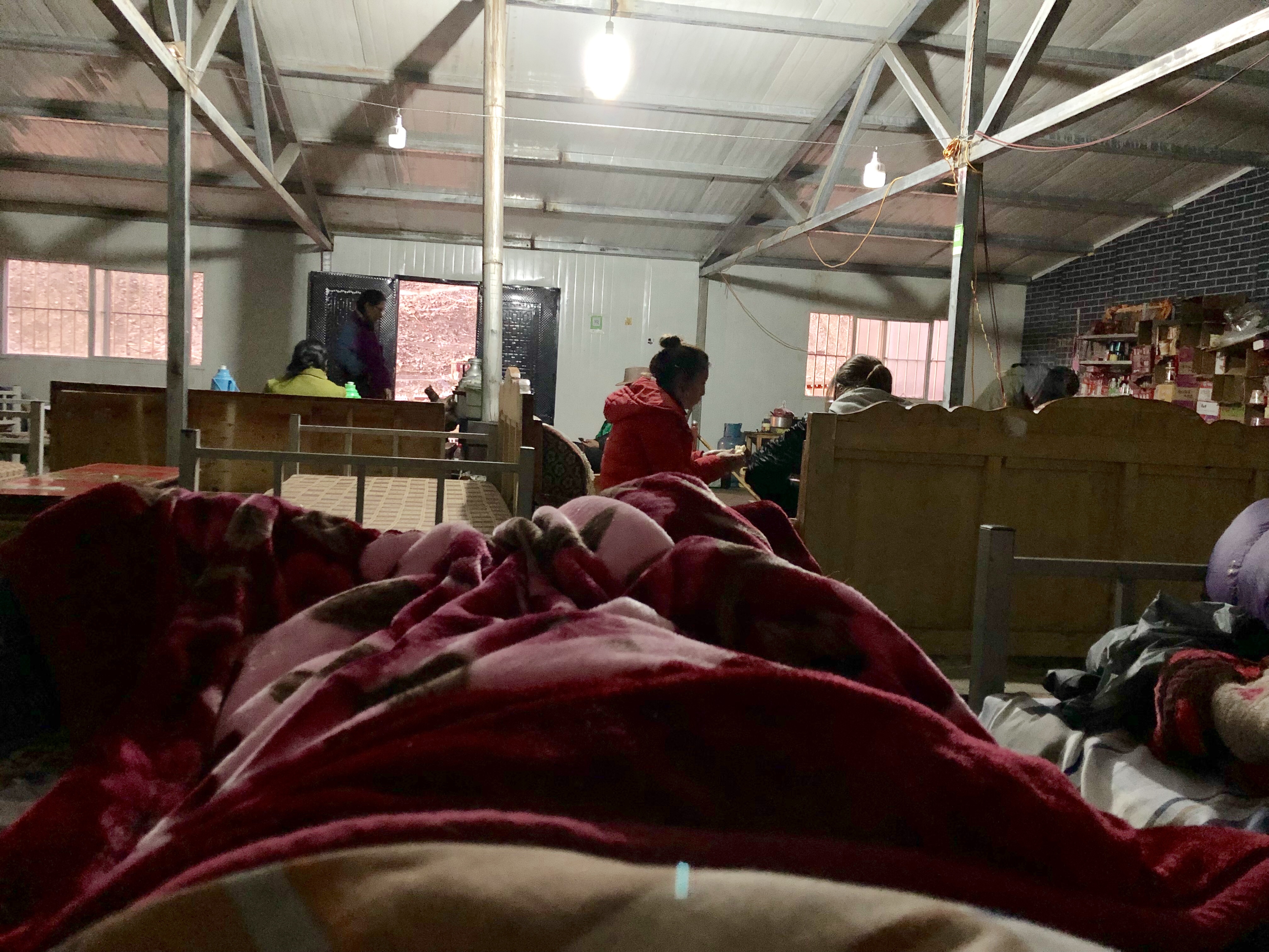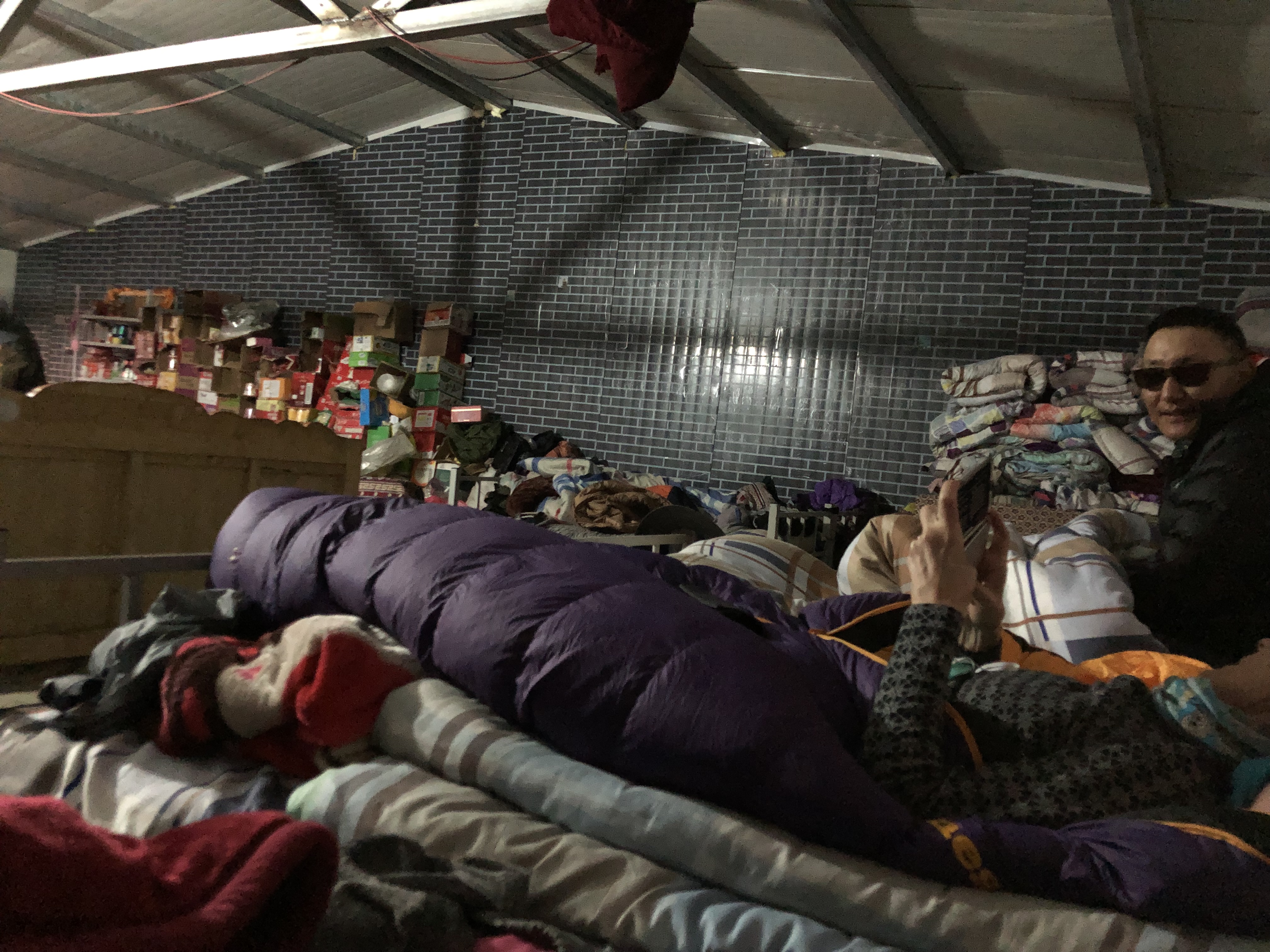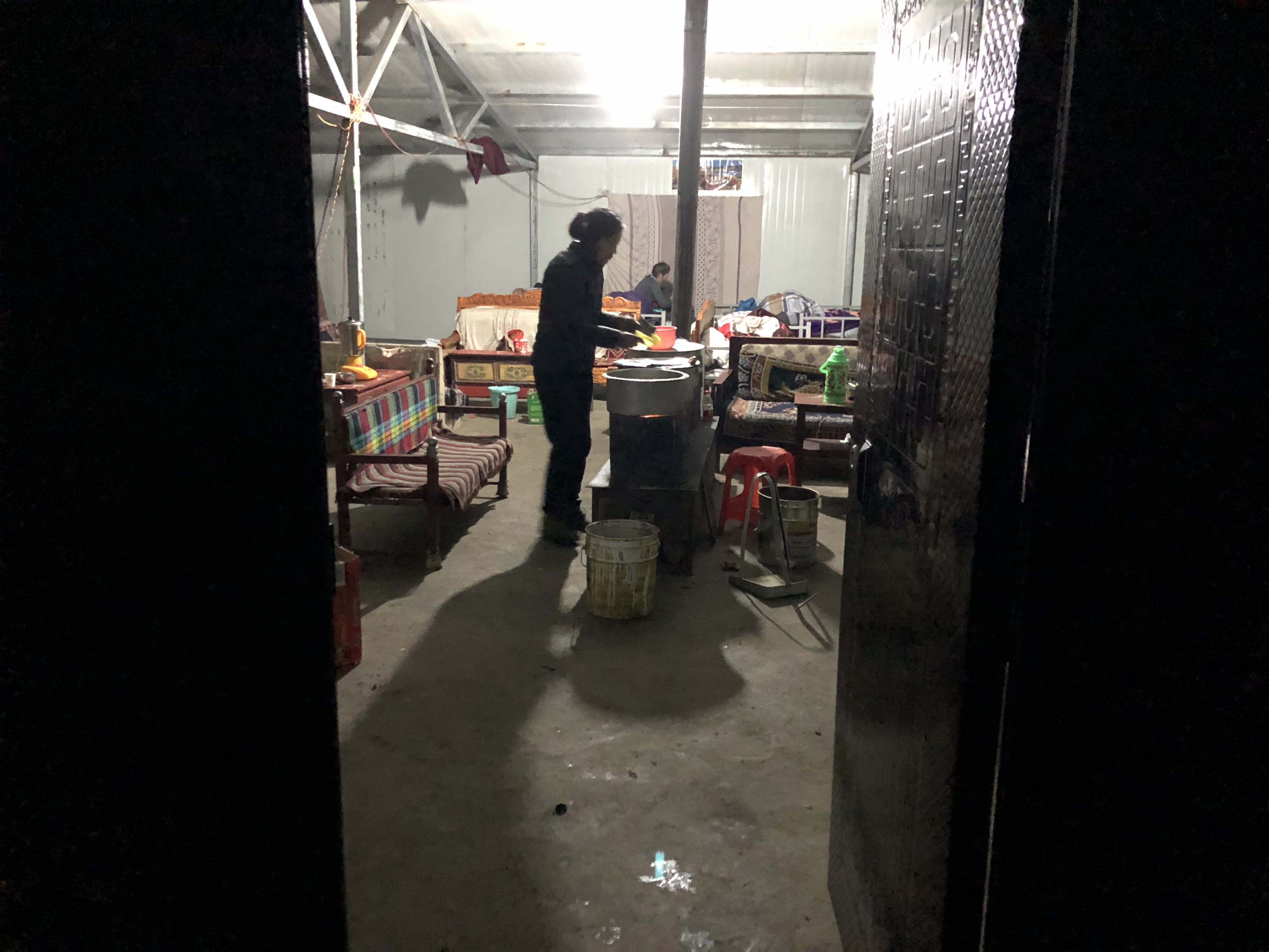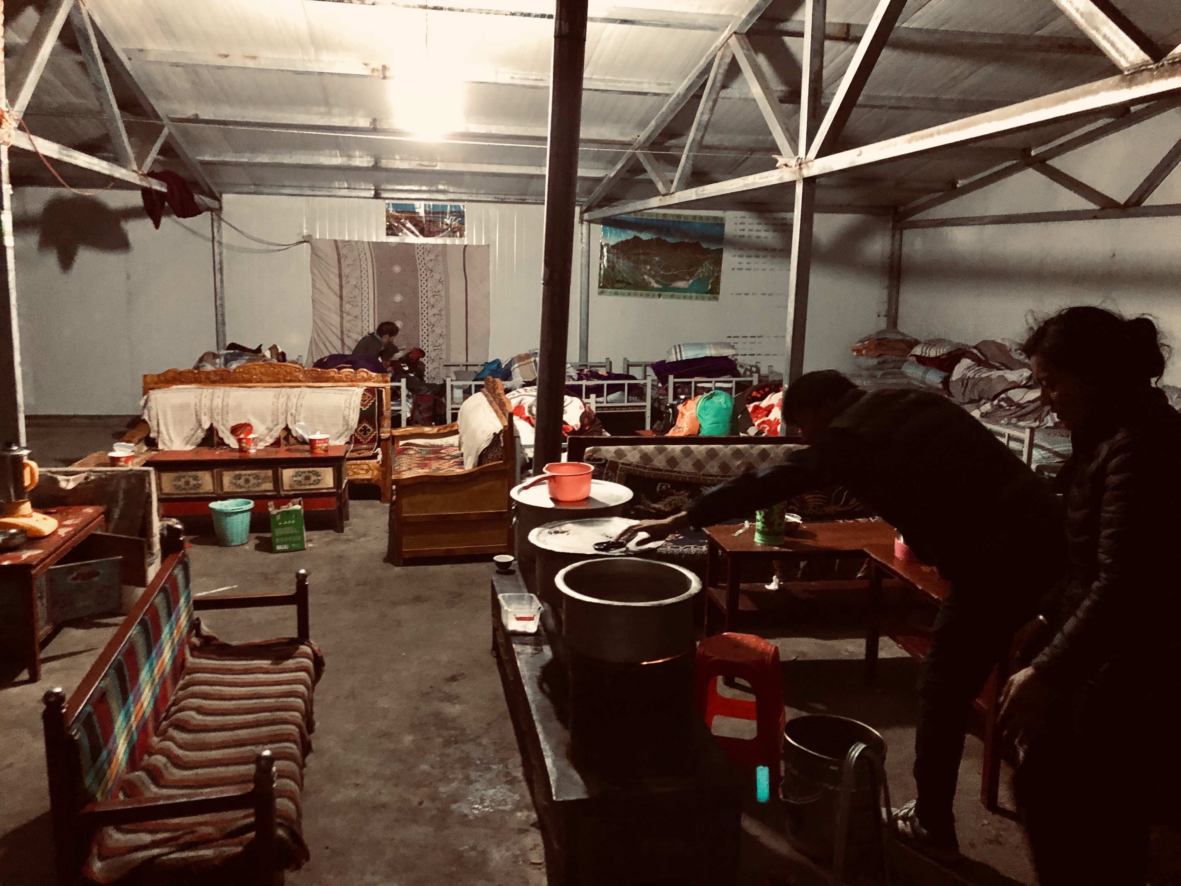 Sleeping in a tea house consisting of one large room filled with many Tibetans (and us). Many bunks on the perimeter lined up so tightly that it’s hard to climb in from the side. Lobsang puts Caroline between himself and me. A cast-iron stove in the center, fueled with Yak dung, cooking dal bhat. Lobsang warning us it might be a noisy place to sleep and it is. He said, “Sometimes people cry, sometimes they cough, sometimes they chant.”