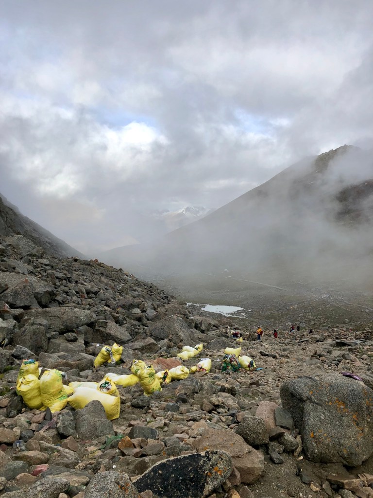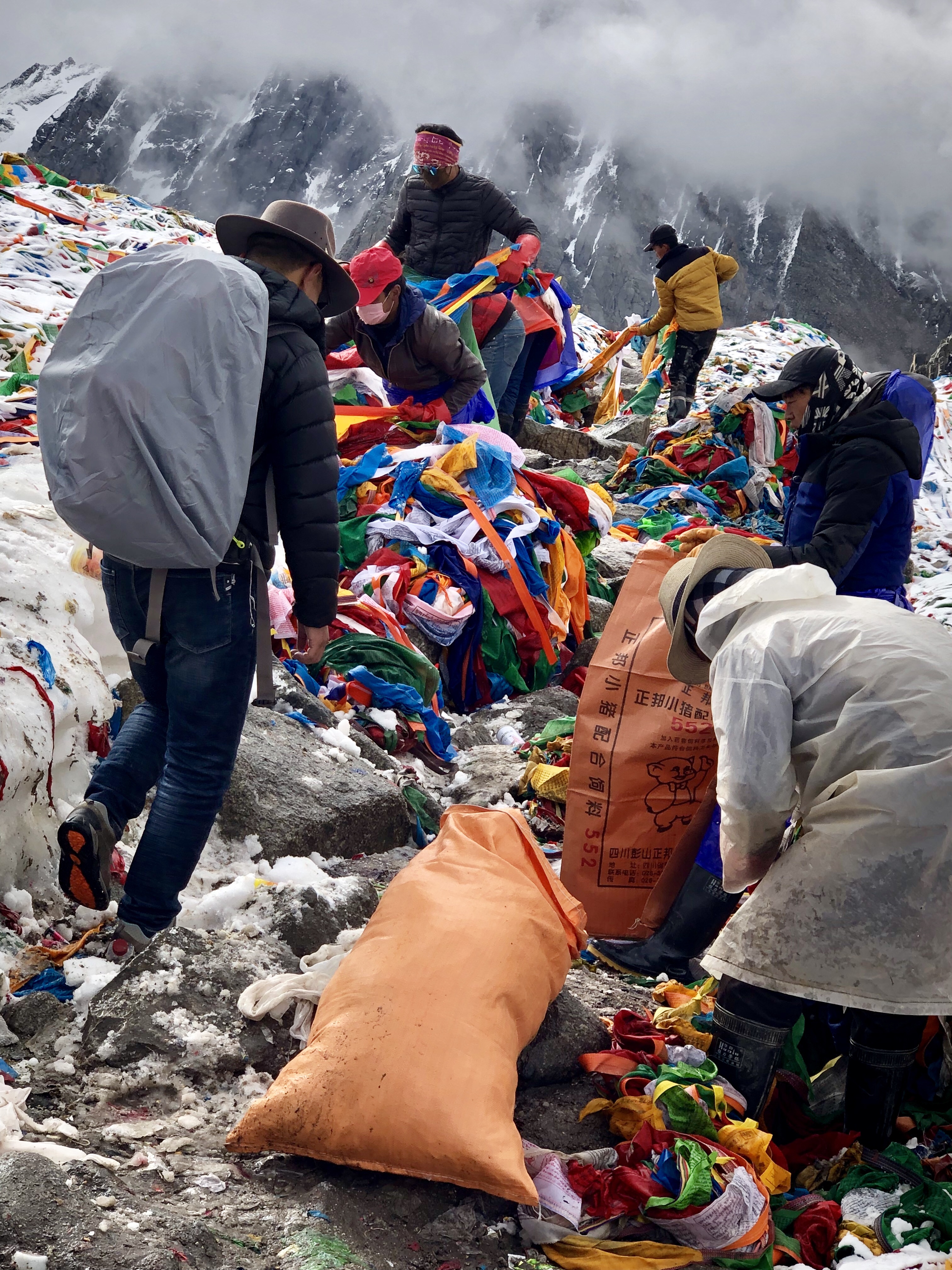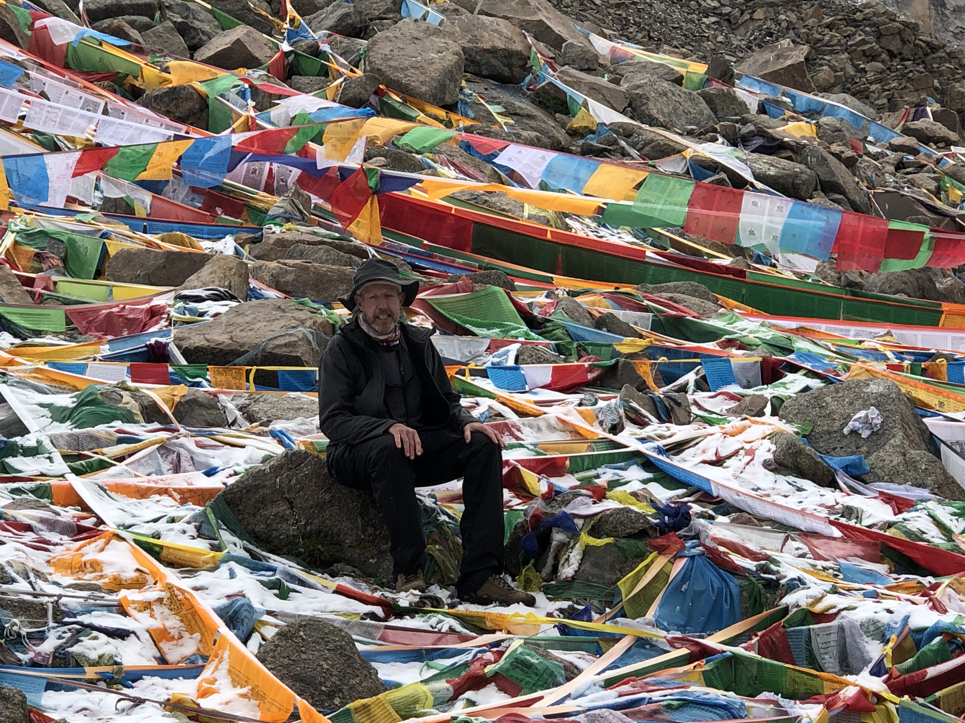 The pass itself is enveloped with prayer flags. A thick pile of them covers the trail and we have no choice but to walk on them. Five colors for the five elements, and on each a mantra and a wind horse to carry the prayers up and away. The summit is the place of rebirth. At 18k ft, it is a physical culmination as well as a spiritual one. Never have I breathed air so thin or so pure.