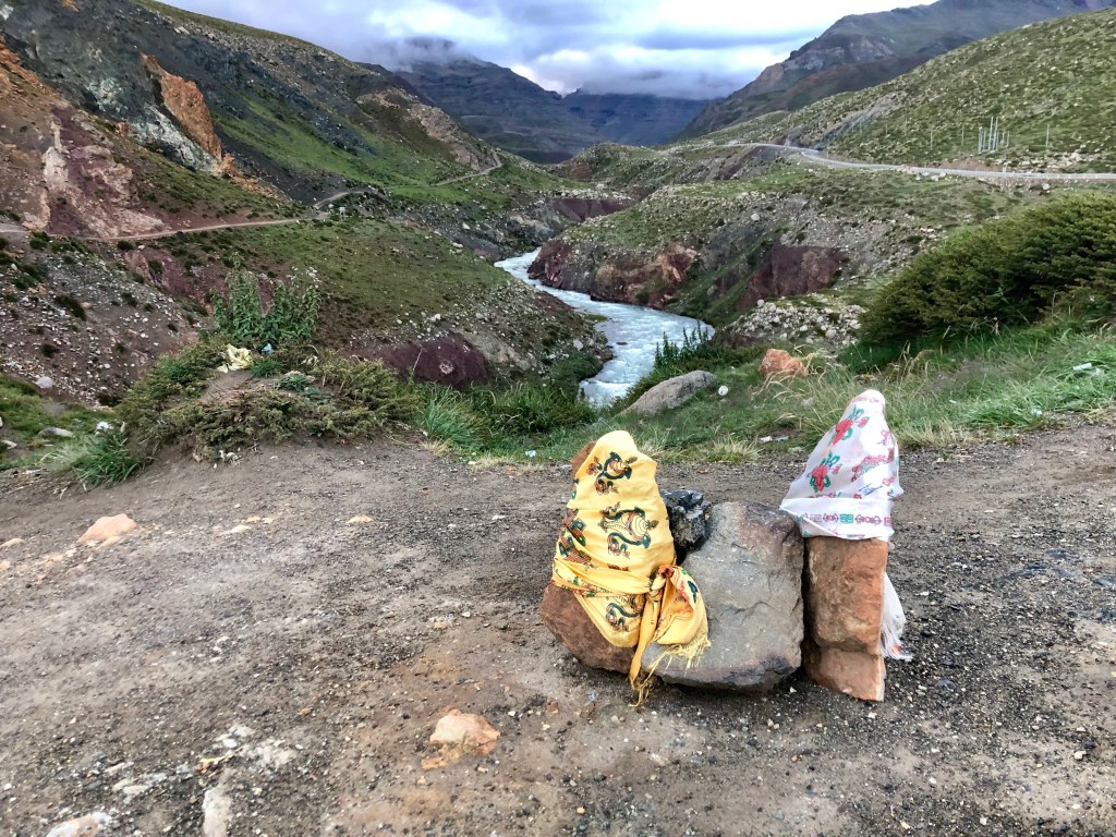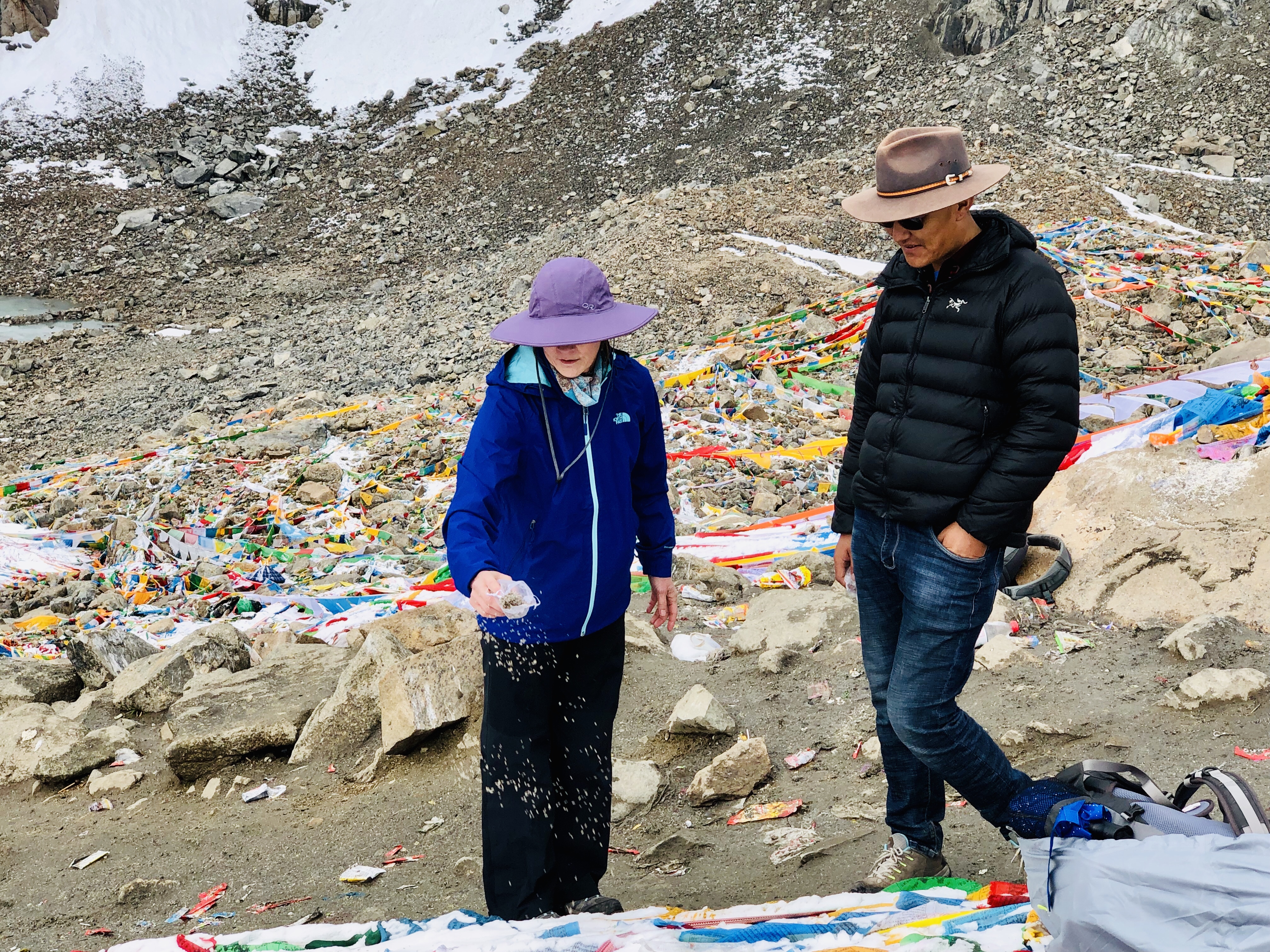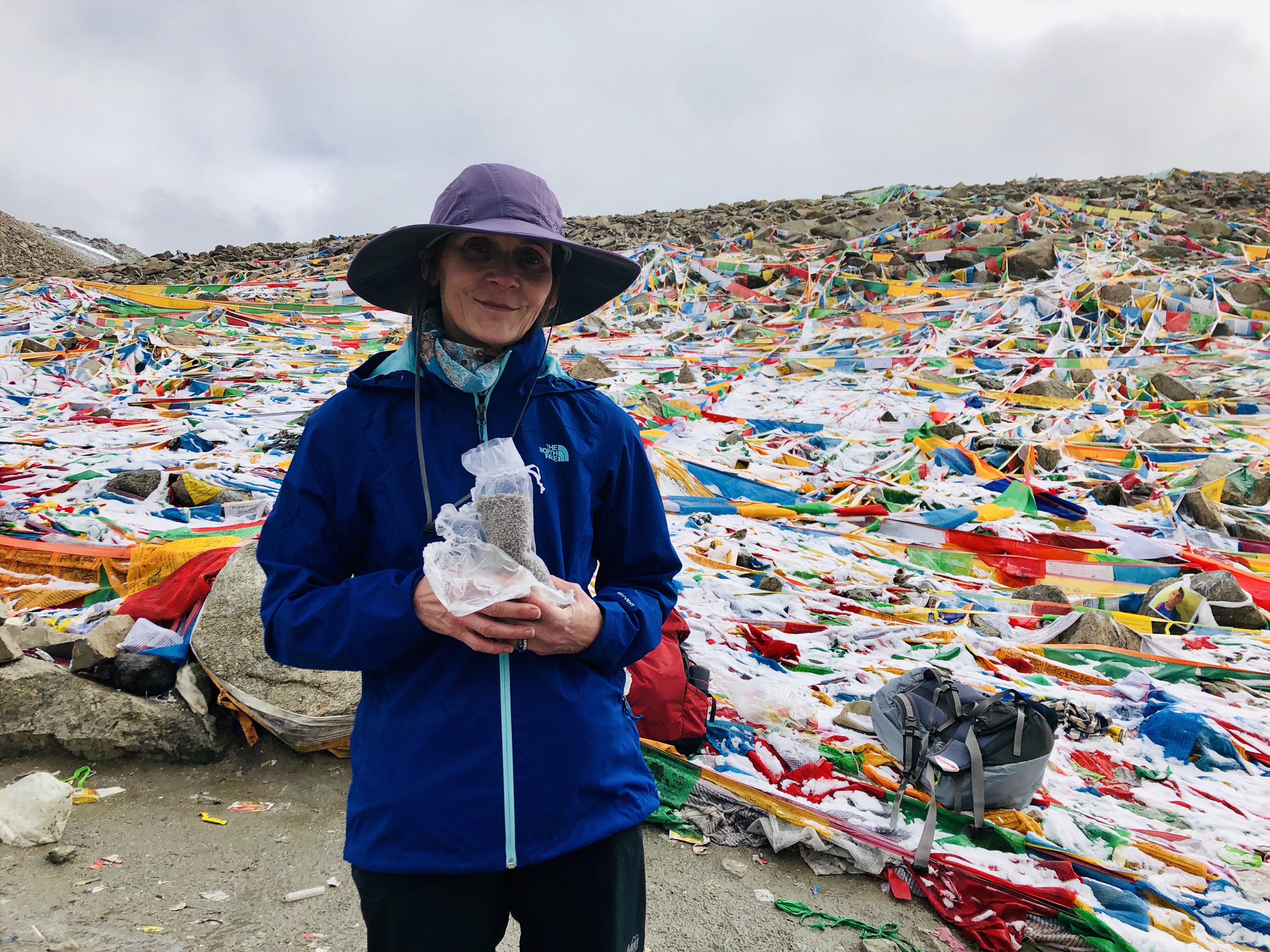 On Drolma La summit there is a place to light incense and a place we find for photos. I leave behind the Barred Owl feather I found on my “day walk” last January and carried with me on my vision quest. Caroline scatters fragrant lavender seeds from our home garden. One last look, then we start down.