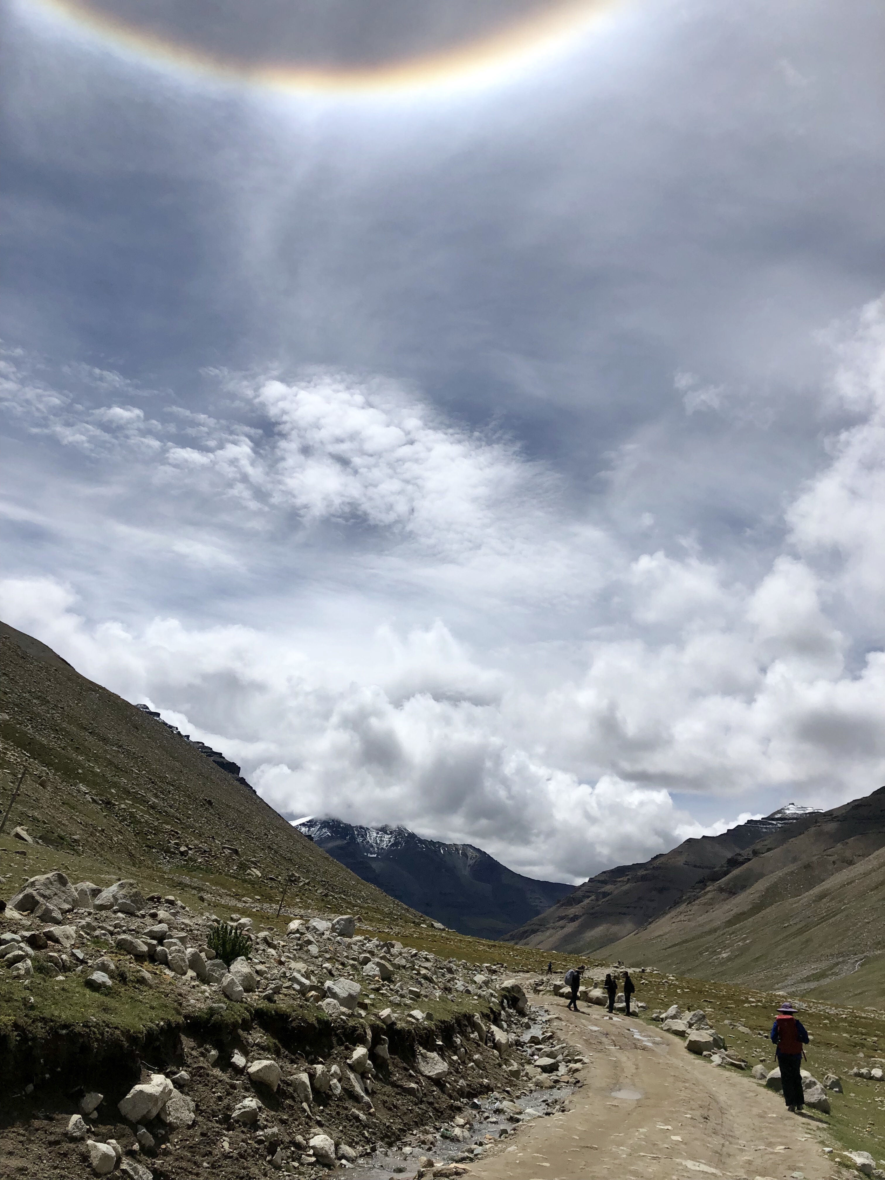 Two rainbows. One that spans a valley and one that forms a halo around the sun. A pilgrim walking the the kora in the opposite direction nudges Caroline and points up to the sky. It was a moment of enchantment.