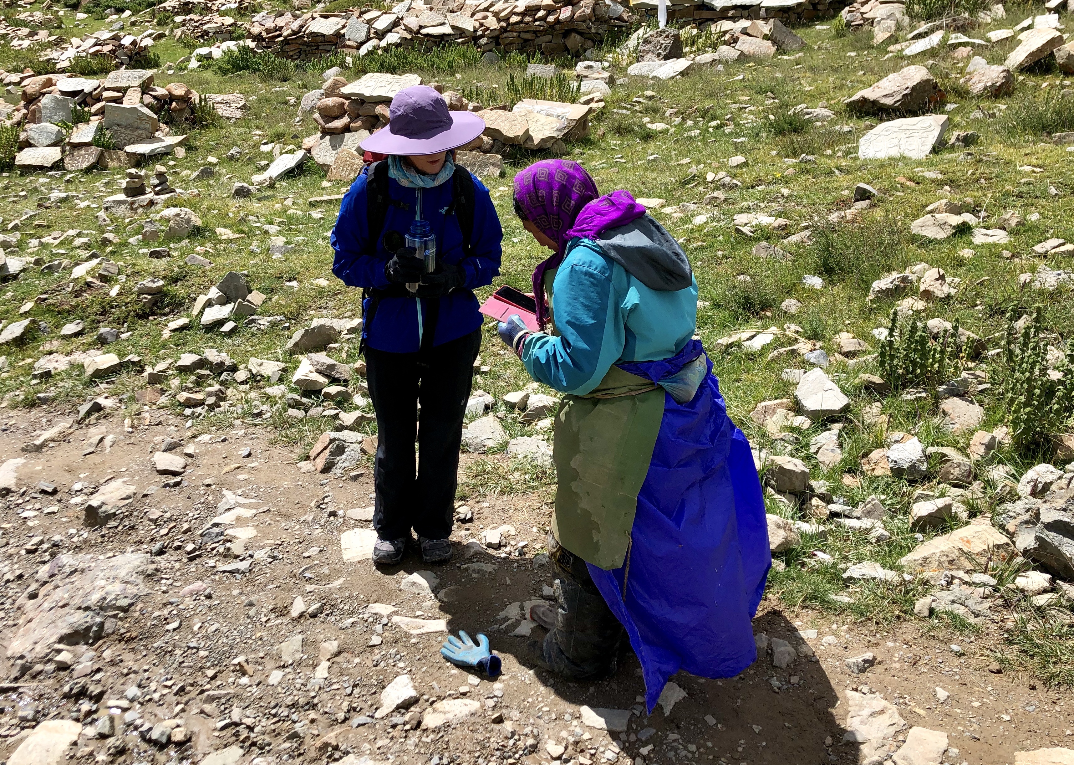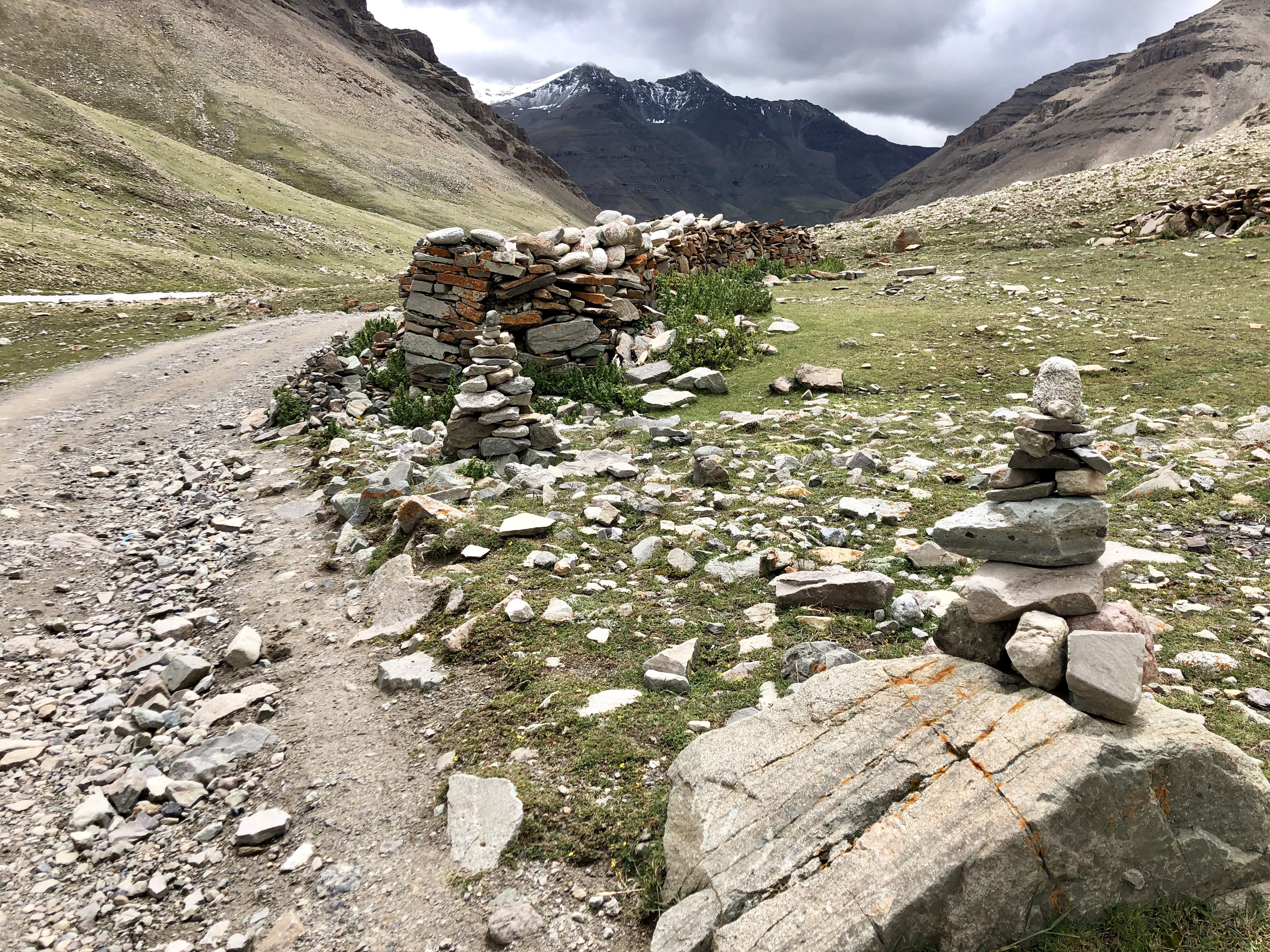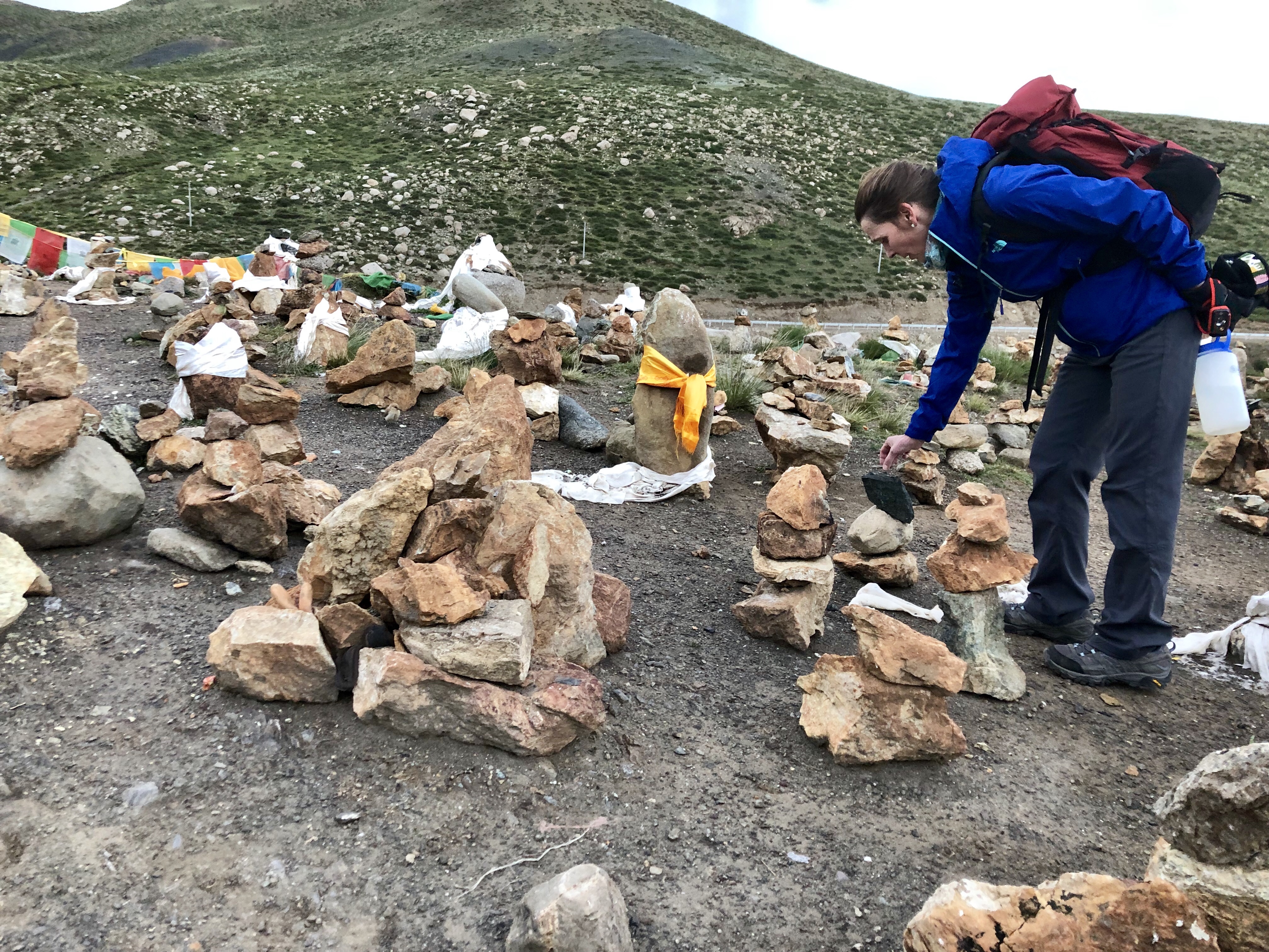 Stones on stones on stones. Mountain people have always constructed rock cairns. They mark the way, both physically and spiritually. The cairns (Tib. laptses) here are too numerous to count. Caroline and I construct a family cairn.