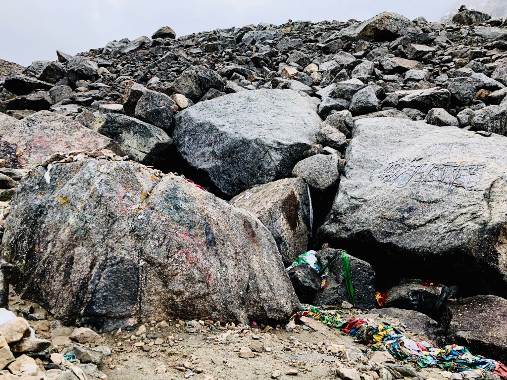 The ascent is both physical and metaphorical, passing by sites meant for ritual and reflection. There is a sin-testing place that pilgrims crawl through and the important Silvatsal (Cool Grove), a place to contemplate my own death, then a section meant to symbolize the Bardo, a Tibetan version of Purgatory. We pass a cave and huge boulder with mani carvings on it. This is the place to honor one’s parents. I place two stones on the boulder. Caroline is quiet and tearful as she remembers her mom and dad. Lobsang respectfully keeps back.