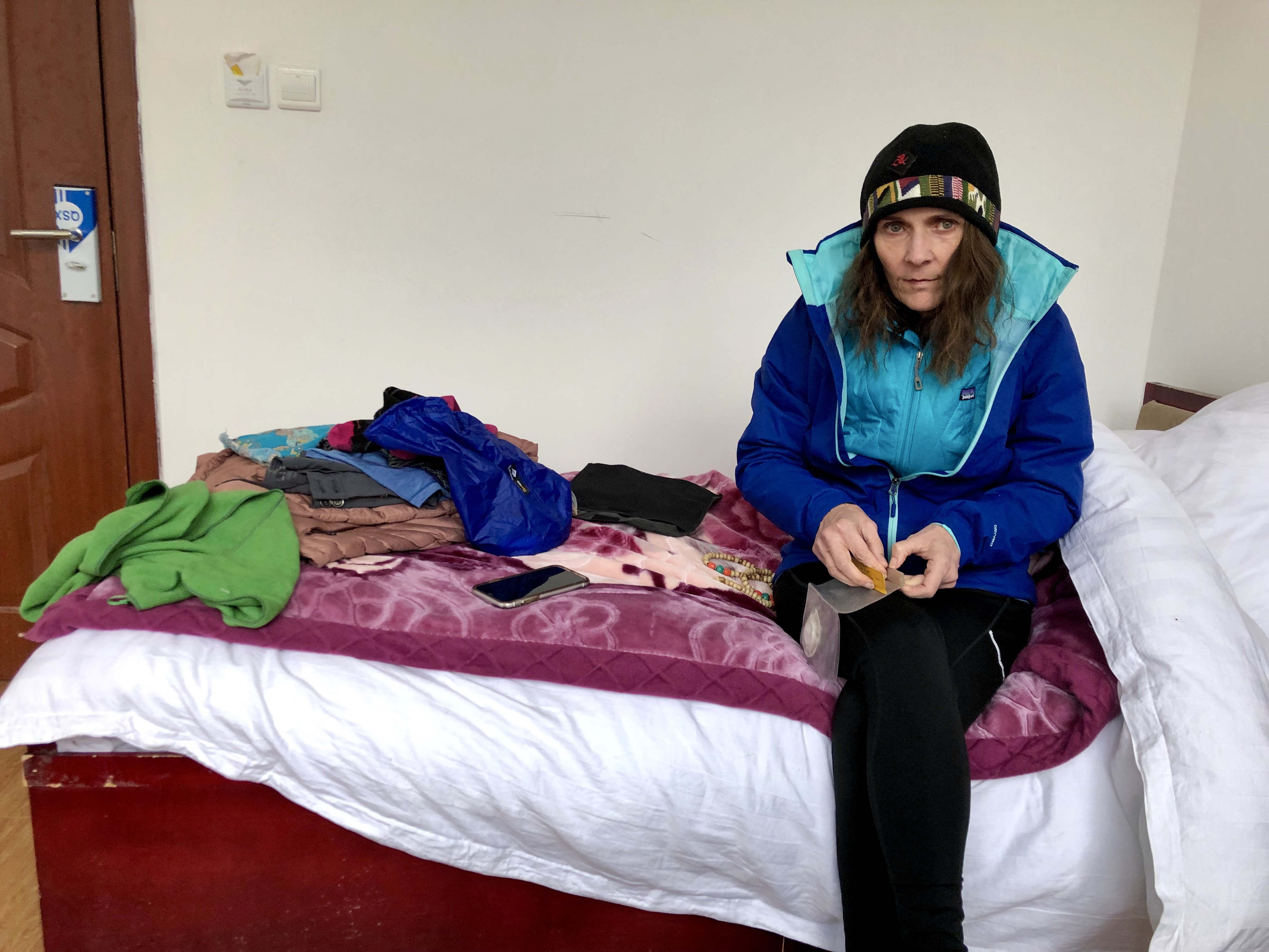 We sit down next a woman who lost her daughter to cancer. She tells Lobsang that she is still very sad and walking the kora is a way of seeking solace. She and Carol exchange smiles and they are able to communicate without language that they are both tired and sore. They reach out their hands to each other and Carol helps the woman stand up. They start walking down the trail but the woman doesn’t let go of Carol’s hand until they come to another woman who is prostrating around Kailash. The grieving woman with bad knees offers the prostrating woman a snack out of our pack we gave her earlier, which she accepts, and also some money of her own, which she refuses.