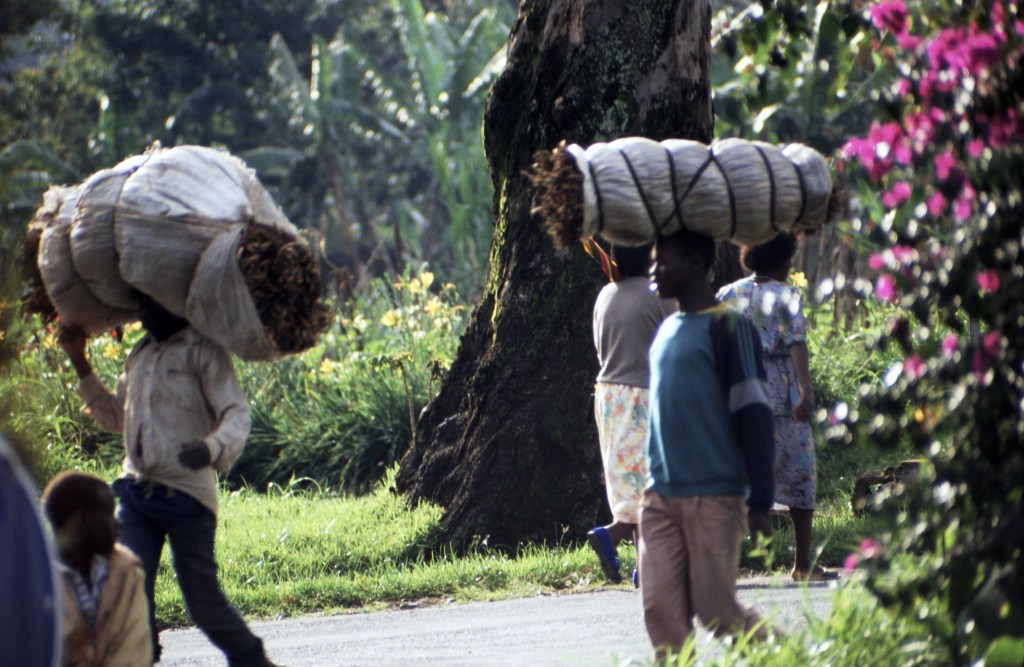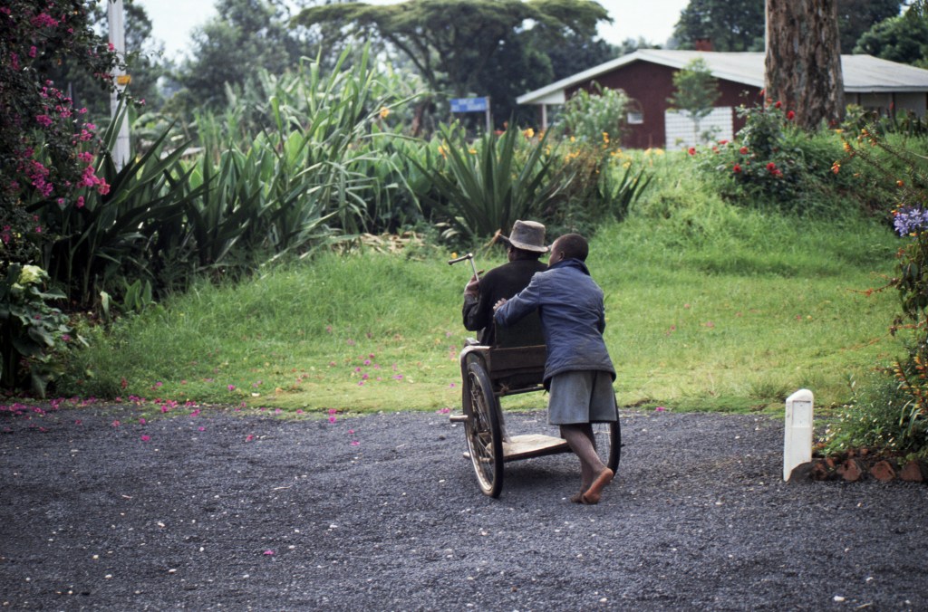 I met Rosamond Car myself. In 1992 I visited her farm near Gisenyi, a town near the shore of Lake Kivu, one of Africa’s Great Lakes in the continent’s Rift Valley. I was there with my sister and brother-in-law who were working in the schools and helping with conservation efforts related to the mountain gorillas. We were living in the village of Ruengheri, which on a map appeared close to Gisenyi but really was not when conditions on the ground were factored in. The roads in Rwanda were trafficked by more people on foot than in motor vehicles, so when we drove to the farm it was slow going. The narrow roadways undulated over emerald hills and into valleys where we fell in line behind processions of pedestrians. There were women dressed in bright iridescent, fabrics, balancing loads of fruit or sugar cane on their heads; barefoot youths pushing carts or bicycles laden with market produce; and old men herding a cow or some goats. On one stretch we were delayed by a Tepoi, or African “ambulance,” which is a stretcher hoisted on the shoulders of four men and used to carry someone to or from the hospital.