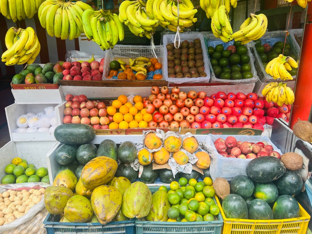 Colorful fresh fruit and vegetables are laid out in orderly rows like a box of crayons.