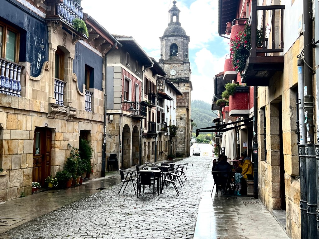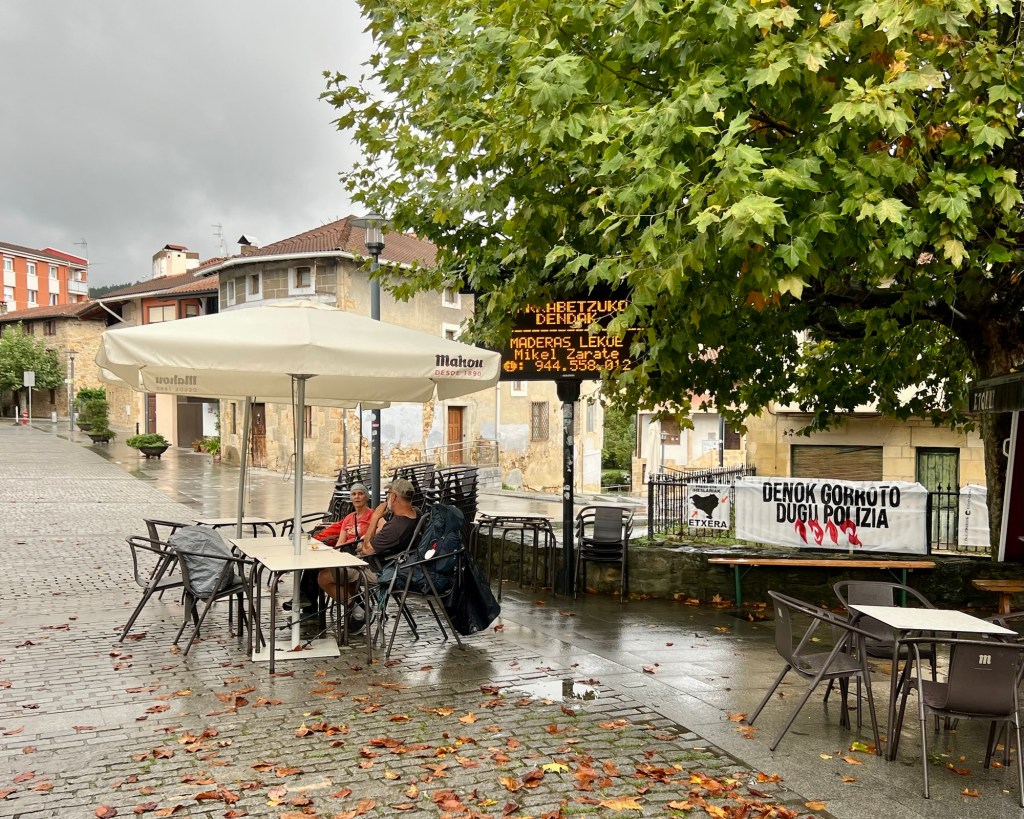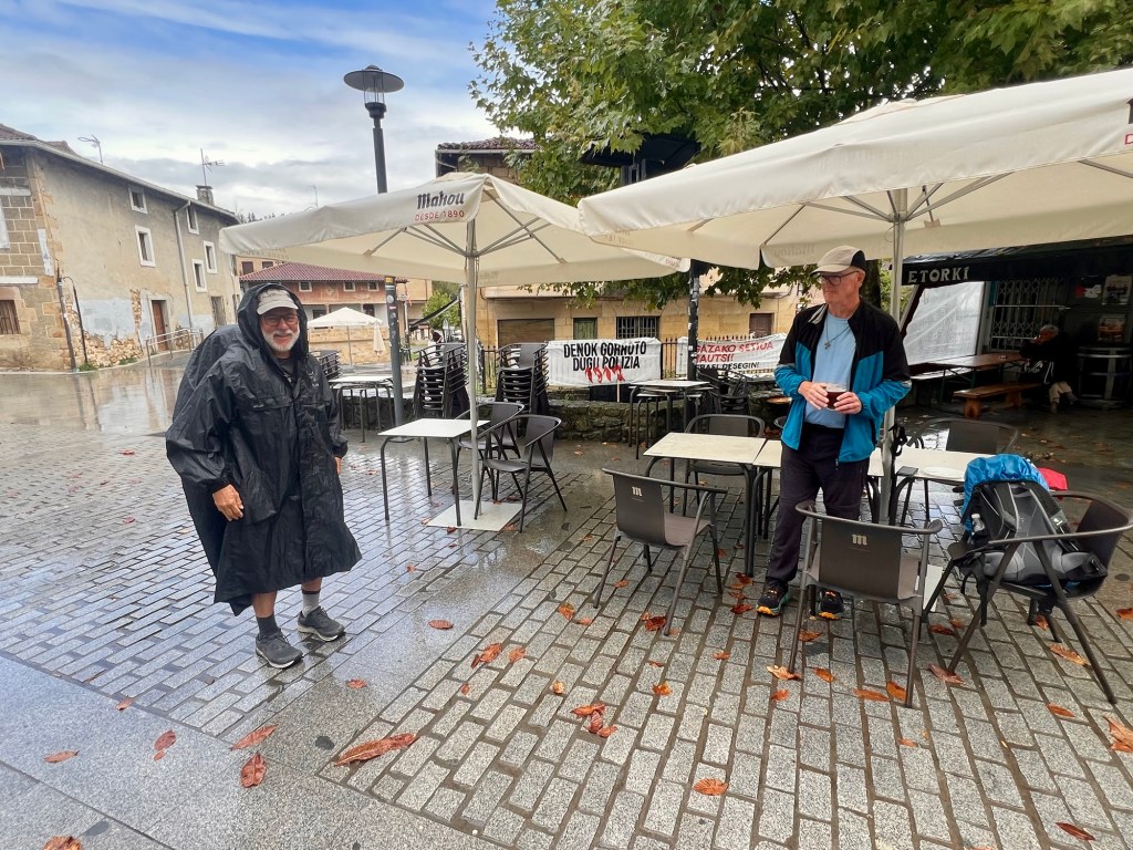 The next day, Caroline and I entered a small village square after walking all morning in the rain. We were wet and tired, and as we climbed the steps toward the only cafe that was open, there sat Abe under an umbrella with two chairs waiting for us, a plate full of Spanish olives on the table,  coffee and empanadas on the way.